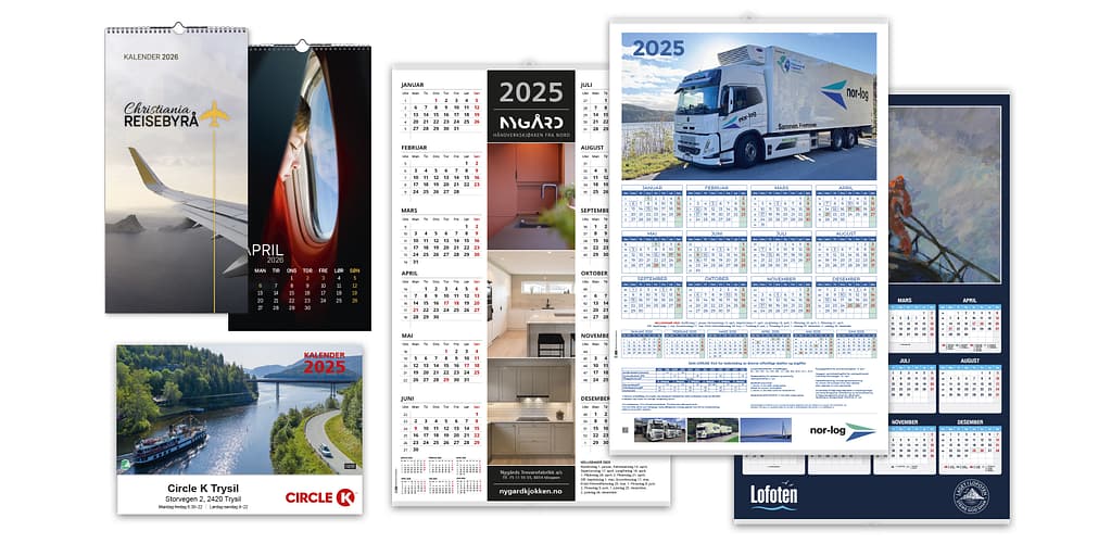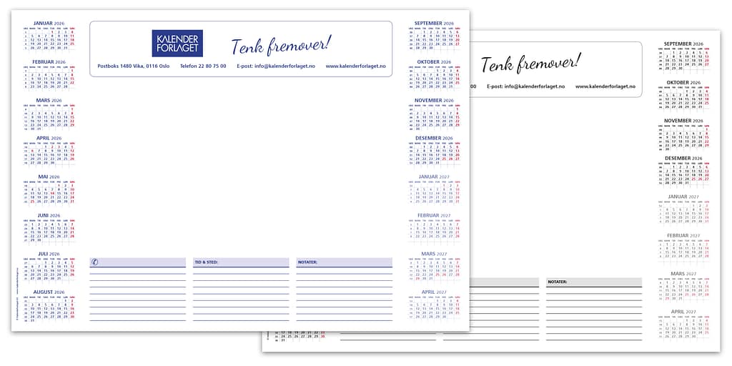Svært rimelig kontaktpris, kundene ser din logo mange ganger hver dag, hele året – slå den! Format A4. Solid kartong. Velg mellom 5 standardvarianter – PlanO, Kyst, Flåklypa, Oker og Classic. Passer også veldig godt til spesialproduksjon.