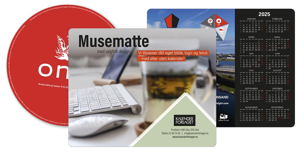 Ny, moderne utførelse – svært brukervennlig! Vi spesialdesigner din musematte, gjerne med ditt eget 4-fargerbilde, og du velger selv om det skal være med eller uten kalender. Standardformat er 25 x 20 cm, men vi tilbyr også andre størrelser og fasonger.